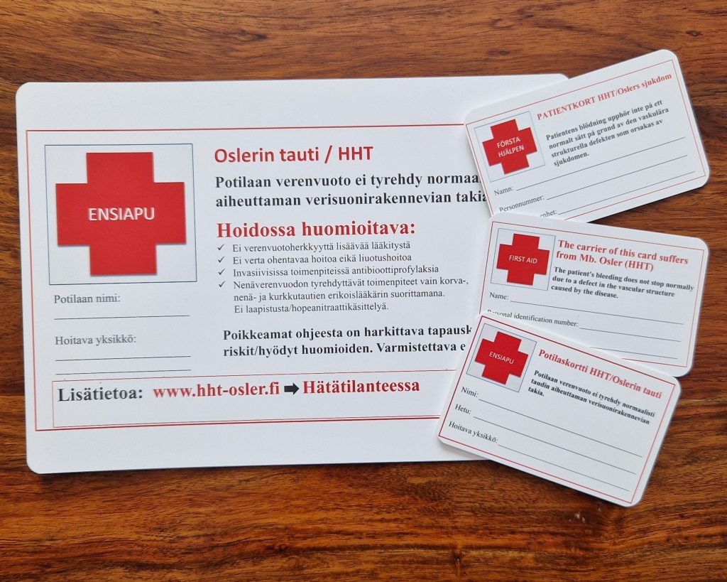 Yhdistyksen jäsenille lähtee ensiviikolla kirjekuori, joka sisältää suomen- , ruotsin- ja englanninkieliset potilaskortit sekä infotaulun ensihoitoa varten. Lämmin kiitos jäsenille, jotka ovat mahdollistaneet potilaskorttien ja ovikyltin tuottamisen. Potilaskortti ja infotaulu lisäävät HHT/Osler- potilaan turvallisuutta. Lompakon tai puhelimen korttilokerossa säilytettävän potilaskortin voi antaa esimerkiksi ensiaputilanteessa terveydenhuollon ammattilaisten käyttöön.