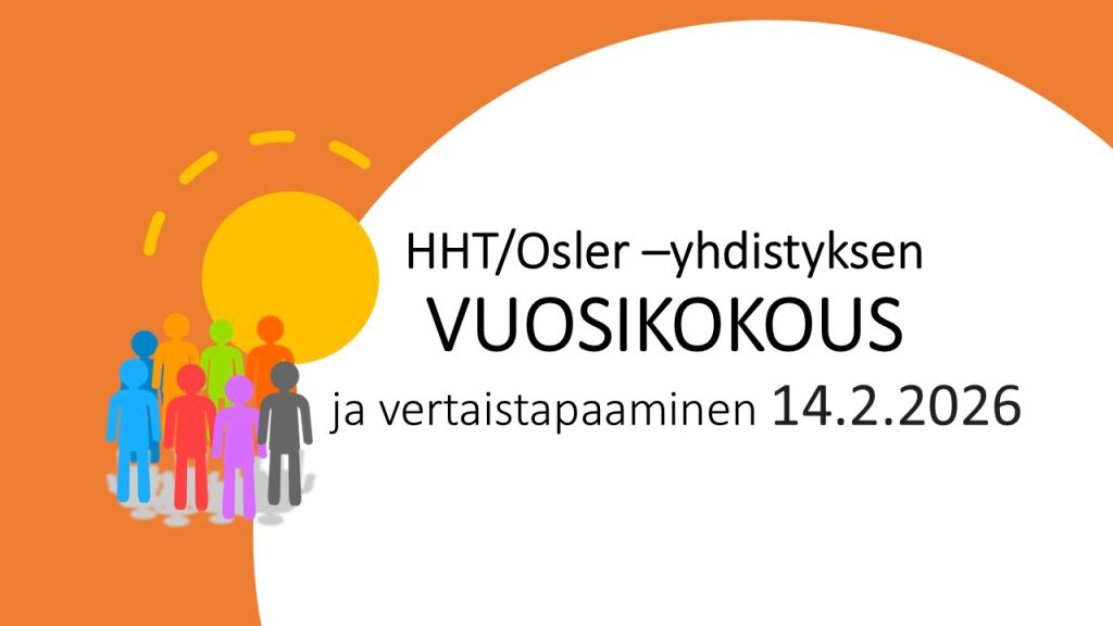 Tervetuloa Suomen HHT/Osler -yhdistyksen vuosikokoukseen lauantaina 14.2.2026 kello 12.00. Kokous järjestetään hybridinä Järvenpäässä, Ravintola Huvilassa, osoitteessa Sibeliuksenkatu 5, Järvenpää. Kokoukseen on mahdollista osallistua myös etänä Teams-sovellusta käyttäen.